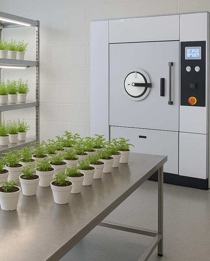 An autoclave is the lab’s industrial-strength "dishwasher." It saturates everything inside—glassware, growth media, tools, even waste—with 250 °F steam under pressure, destroying every microbe in about 15 minutes. Modern units recycle heat and water, run on programmable cycles, and roll into place like a large refrigerator.Why it matters to BTI’s mission:Pure experiments, reliable results. Sterile media and equipment keep unwanted bacteria or fungi from skewing research results, so discoveries translate cleanly from lab bench to farmer’s field.Safety & compliance. Pressurized steam also decontaminates genetically modified materials and plant pathogens before disposal, meeting NIH and USDA biosafety rules and protecting staff and the community.Stewardship of donor dollars & the planet. Modern models cut utility use dramatically (case studies show > 50 % less energy and nearly 90 % less water), reducing operating costs for years to come.